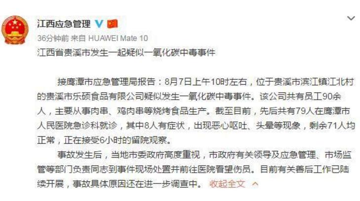 據江西應急管理官方微博消息,接鷹潭市應急管理局報告:8月7日上午10時左右,位于貴溪市濱江鎮江北村的貴溪市樂碩食品有限公司疑似發生一氧化碳中毒事件。該公司共有員工90余人,主要從事肉串、雞肉串等燒烤食品生產。截至目前,先后共有79人在鷹潭市人民醫院急診科就診,其中8人有癥狀,出現惡心嘔吐、頭暈等現象,剩余71人均正常,正在接受6小時的留院觀察。