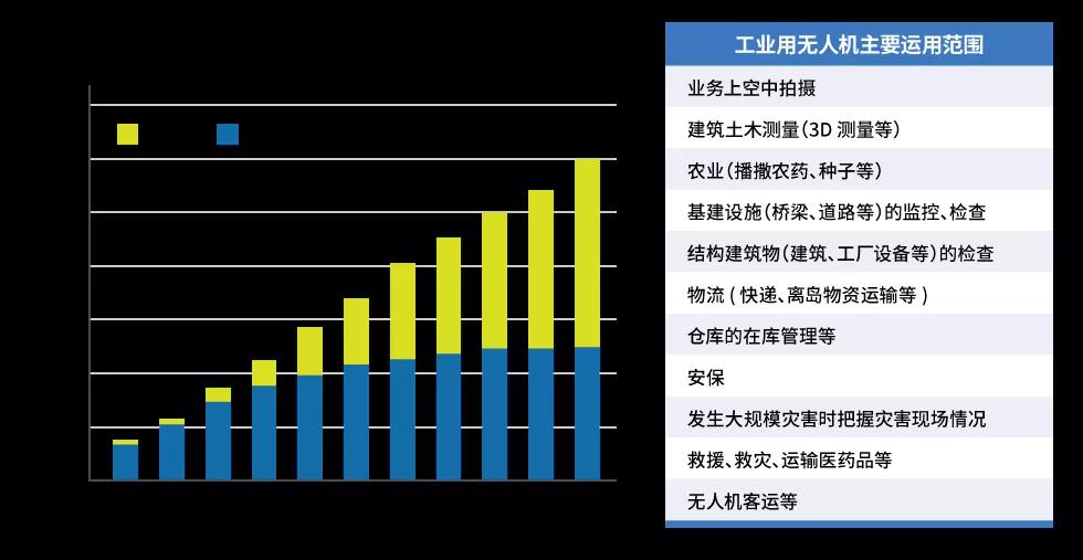 無人機可分為個人興趣用和競技用的小型輕量普通民用無人機,以及可用于專業的空中拍攝、測量、監控、檢查、農業、物流等領域的工業用無人機。自被稱為無人機元年的2015年之后,出貨的大多數的無人機基本是普通民用無人機,近年來工業用無人機銷售數增長率大幅提升,預測在2023年以后工業用無人機出貨數量將超過普通民用無人機。