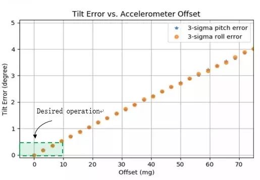 無人機的核心在于其姿態航向參照系統(AHRS),其中包括慣性傳感器、磁力計和處理單元。AHRS估算設備定位,例如滾動、俯仰和偏航角。傳感器誤差(如偏移、靈敏度誤差或熱漂移)會導致定位錯誤。下圖顯示了加速度計偏移函數形式的定位誤差(滾動、俯仰角),這通常是造成傳感器連續誤差的核心根源。例如,僅20?mg的加速度計偏移便會導致設備方向出現1度誤差。