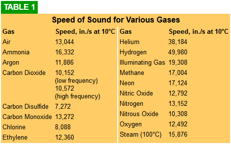 ?,c(T):空氣中聲速與溫度函數,單位:英寸/秒;T:大氣溫度,單位:℃。不同氣體介質中的聲速與空氣組成的關系,同時受化學成分和溫度的影響。下表是10°C 的各種氣體的聲速。