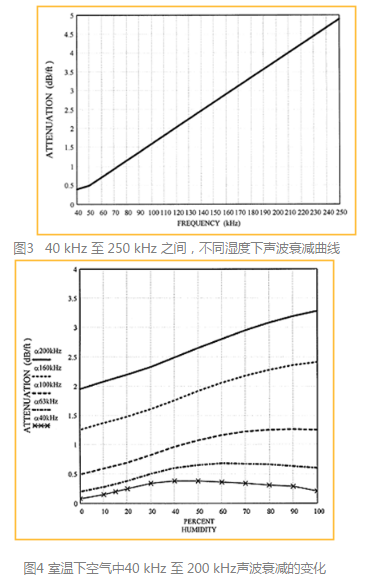 隨著聲波的傳播,由于傳輸介質中的摩擦損失,聲壓的振幅降低。了解這種吸收損耗或衰減的值對于確定傳感器的大范圍至關重要。空氣中聲波的衰減隨頻率的增加而增加;在給定頻率下,衰減隨濕度的變化而變化。產生大衰減的濕度值對于所有頻率都不一樣。例如,超過 125 kHz,大衰減發生在 100% RH;在40kHz時,大衰減發生在 50% RH。