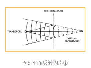 如果聲波脈沖從一個大的平面反射,則整個光束將被反射 (參見圖 5)。這種總波束反射相當于距離兩倍的虛擬源。因此,從大平面反射的聲波的傳播損耗等于 20 log (2R),吸收損耗等于2αR。為了保持這一點,重要的是反射表面都要大于整個聲束,以確??偡瓷?,并垂直于聲束。