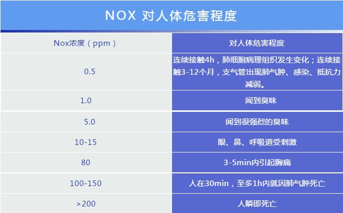 NO2為黃色液體或棕紅色氣體,能溶于水、生成硝酸和亞硝酸,具有腐蝕性。NO和血紅蛋白的親和力比CO大幾百倍,動物接觸高濃度的NO,可出現中樞神經病變。NO2對眼和呼吸氣管有刺激作用,高濃度的NO2急性中毒能引起氣管炎和肺氣腫,嚴重者可導致死亡。NOX還可形成光化學煙霧、嚴重影響視野,NOX分級濃度的危害程度見表1。