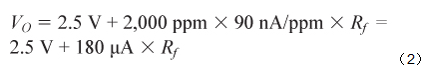 傳感器的大響應為90 nA/ppm,如表2所示,其大輸入范圍為2,000 ppm。因此,大輸出電流為180 μA,大輸出電壓由跨導電阻決定,如公式2所示。