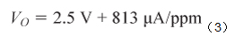 使用65 nA/ppm的典型傳感器響應,可以通過下式將輸出電壓轉換為一氧化碳的ppm: