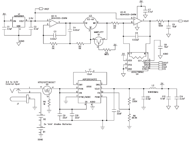 該電路由兩節AAA電池供電。使用二極管提供反向電壓保護會浪費寶貴的電能,因此本電路使用P溝道MOSFET (Q2)。該MOSFET通過阻塞反向電壓來保護電路,施加正電壓時導通。MOSFET的導通電阻小于100 mΩ,因此它引起的壓降遠小于二極管。除AAA電池以外,降壓-升壓調節器ADP2503還允許使用高5.5 V的外部電源。在省電模式下工作時,ADP2503的功耗僅38 μA。由L2、C12和C13構成的濾波器可消除模擬電源軌產生的任何開關噪聲。連接外部電源時,該儀表不是通過一個電路來斷開電池,而是利用一個插孔以機械方式斷開電池,從而避免電能浪費。