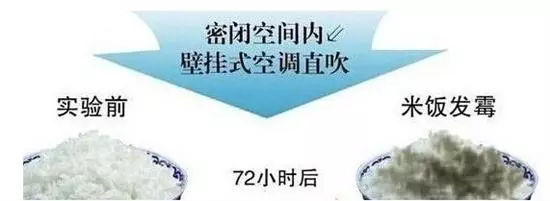 實(shí)驗(yàn)過程:取兩碗等量的白米飯,置于壁掛式空調(diào)下的桌子上,其中一碗蓋好。關(guān)閉門窗,打開空調(diào)。72小時(shí)后,蓋好的米飯只是略有變色,但敞露于空調(diào)下的那碗米飯,已經(jīng)長(zhǎng)毛,發(fā)現(xiàn)大片霉斑。