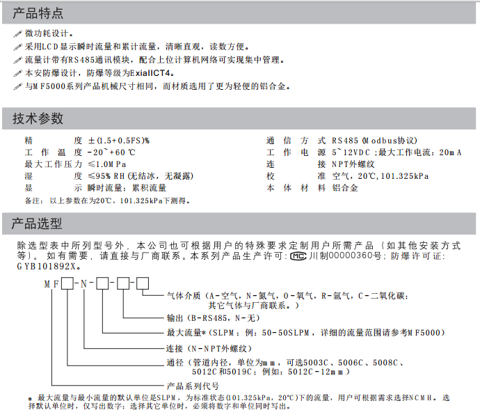 MF4000系列氣體質量流量計是專門為各類小流量氣體的測量和過程控制而設計的。這一系列流量計均采用本公司自主研發的微機電系統(MEMS)流量傳感芯片來制作,適用于各類清潔、干燥氣體。獨特的封裝技術使之在相同的管徑下可測量不同范圍的流量,成本低、易安裝、不需要溫度壓力補償,可替代容積式或壓差式的傳統流量計并配以多種信號輸出,通過通訊接口可實現對流量計的靈活配置與參數查詢。MF4000具備LED數字顯示和按鍵功能,允許用戶在現場調整或查詢流量計的參數。