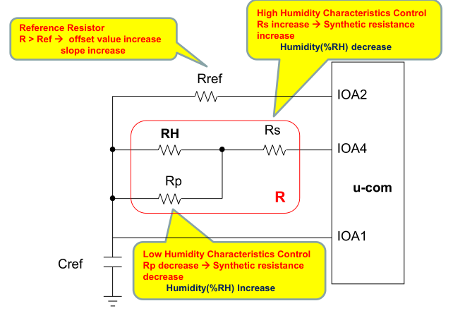 電阻式濕度傳感器的濕度檢測有兩種方法。一種是使用運算放大器,另一種是使用ADC/RFC內置u-COM。由于ADC內置u-COM電路設計簡單,使用方便,所以通常采用它。