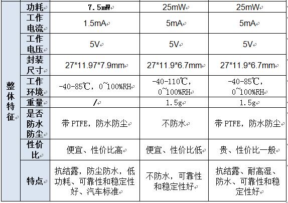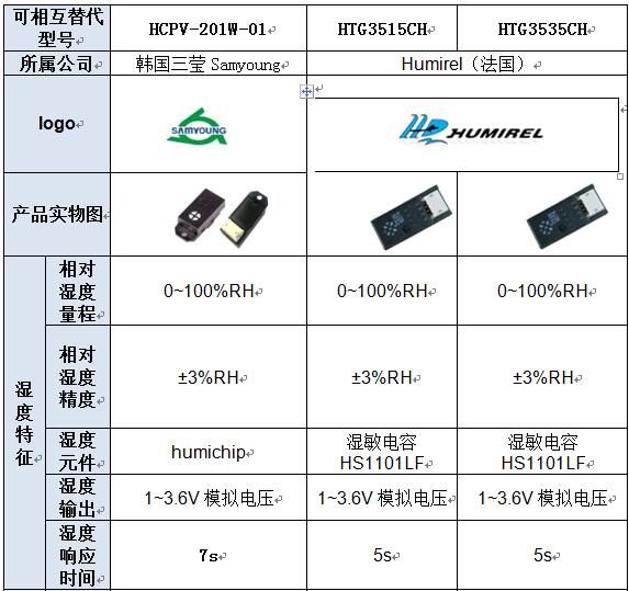 HCPV-201W-01具備AWC-Q100認(rèn)證,符合汽車行業(yè)標(biāo)準(zhǔn)要求的一款傳感器,由工采網(wǎng)引進(jìn)的一款高質(zhì)量溫濕度傳感器,可靠性和長期穩(wěn)定性是值得信賴的,可以很好替代同類型幾乎所有的溫濕度模塊,其中,可以PIN對(duì)PIN替換法國humirel的溫濕度傳感器模塊HTG3515CH/HTG3535CH,下表概括了三款產(chǎn)品的基本情況: