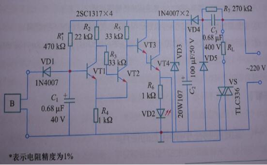 上圖中,B為SY-DS-1結露傳感器,用于檢測浴室內空氣中的水汽,VT1和VT2組成施密特電路,它可以根據結露傳感器感知水汽后的電阻值變化,實現兩種穩定的狀態,當玻璃鏡面周圍的空氣中濕度變低時,結露傳感器的電阻值變小,VT1的基極電位約為零點幾伏,VT2的集電極為低電位,VT3和VT4截止,雙向晶閘管不導通。如果玻璃鏡面周圍的濕度增加,使結露傳感器的電阻值增大到某個值時,VT1導通,VT2截止,其集電極的電位變成高電位,VT3和VT4導通,觸發晶閘管VS導通,加熱絲R通電,使玻璃鏡面加熱。隨著鏡面溫度逐漸,鏡面水汽被蒸發,從而使鏡面恢復清晰。加熱絲加熱的同時,指示燈VD2電亮。調節R的阻值,可使加熱絲在確定的某相對濕度條件下開始加熱。