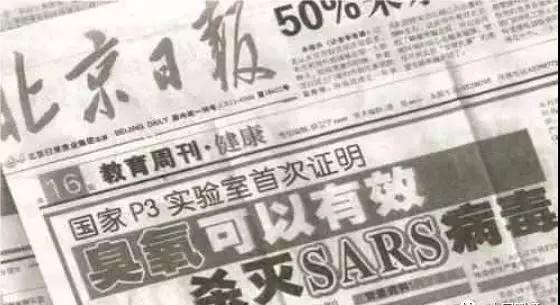 武漢大學(xué)生命科學(xué)學(xué)院的張珈敏,鄭從義等人在“中國消毒學(xué)雜志”2004年01期上發(fā)表的《臭氧水對SARS病毒的滅活效果觀察》一文中寫:用臭氧水對SARS病毒進行滅活實驗,當臭氧含量為27.73mg/L時,作用4min可完全滅活SARS病毒;當臭氧含量為17.82mg/L,作用4min和4.86mg/L作用10min,均可使SARS病毒的滅活率達100%。