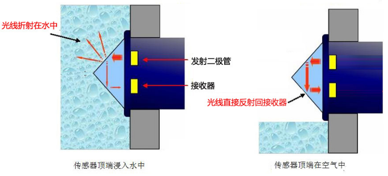 光電式液位傳感器是利用光學(xué)反射原理檢測(cè)液位,無(wú)水時(shí)候接受到發(fā)射管發(fā)射出的所有光線,判斷為無(wú)水狀態(tài);有水時(shí)光線折射在水中,只能接收到少量管線,判斷為有水狀態(tài)。