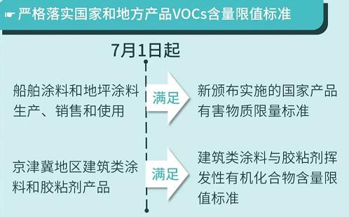 嚴格落實國家和地方產品VOCs含量限值標準。2020年7月1日起,船舶涂料和地坪涂料生產、銷售和使用應滿足新頒布實施的國家產品有害物質限量標準要求。京津冀地區建筑類涂料和膠粘劑產品須滿足《建筑類涂料與膠粘劑揮發性有機化合物含量限值標準》要求。督促生產企業提前做好油墨、膠粘劑、清洗劑及木器、車輛、建筑用外墻、工業防護涂料等有害物質限量標準實施準備工作,在標準正式生效前有序完成切換,有條件的地區根據環境空氣質量改善需要提前實施。
