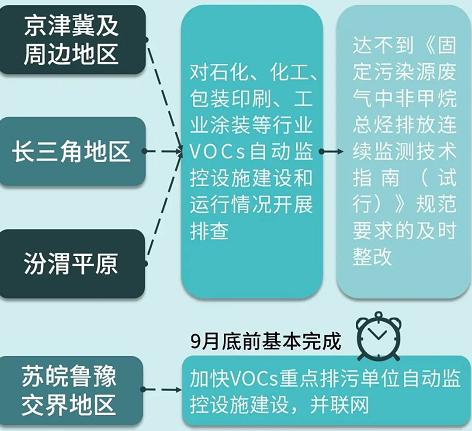 加強污染源VOCs監測監控。重點區域要對石化、化工、包裝印刷、工業涂裝等行業VOCs自動監控設施建設和運行情況開展排查,達不到《固定污染源廢氣中非甲烷總烴排放連續監測技術指南(試行)》規范要求的及時整改。其他地區要加快VOCs重點排污單位自動監控設施建設,并與當地生態環境部門聯網,蘇皖魯豫交界地區9月底前基本完成,全國12月底前基本完成。鼓勵各地按照《揮發性有機物無組織排放控制標準》附錄A要求,開展重點管控企業廠區內無組織排放監測,監控企業綜合控制效果。鼓勵各地對納入重點排污單位名錄的企業安裝用電監控系統、視頻監控設施等。加快推進儲油庫、加油站油氣回收裝置自動監控設施建設。加強對企業自行監測及第三方檢測機構的監督管理,提高企業自行監測數據質量,公開一批監測數據質量差甚至篡改、偽造監測數據的機構和人員名單。