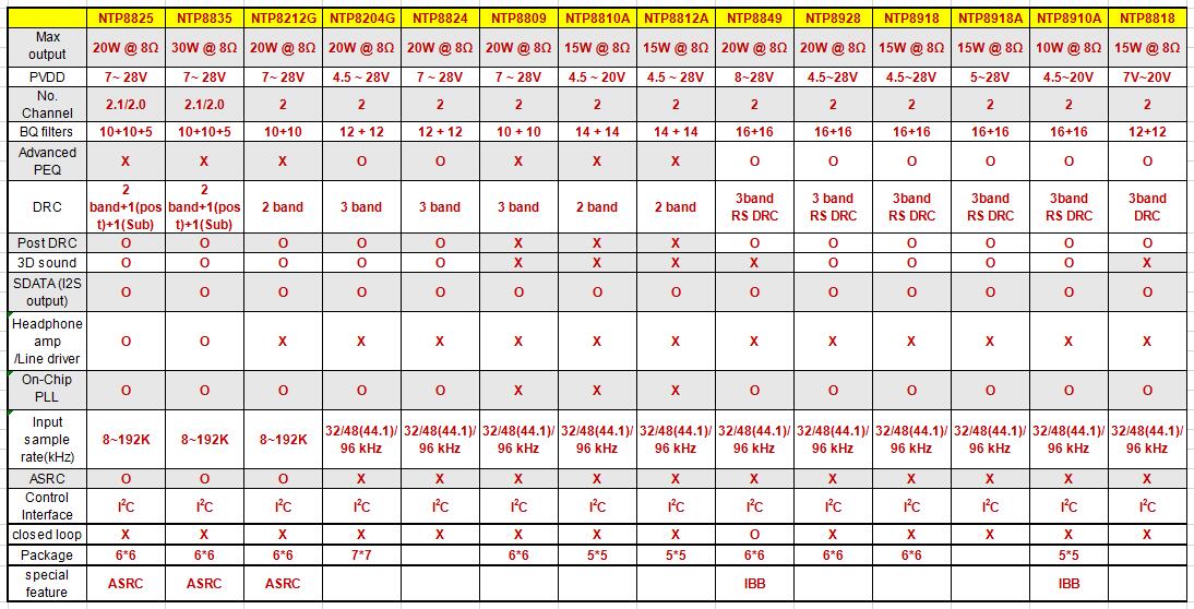 - NTP8849,是韓國NF的旗艦級芯片,在此前芯片的基礎上加上了閉環功能,是一顆具有強大性能的全數字Class-D閉環功放;可以實現多階諧波的抑制,以及應對電源不穩的情況下穩定輸出,在許多知名品牌機型上都有選用。