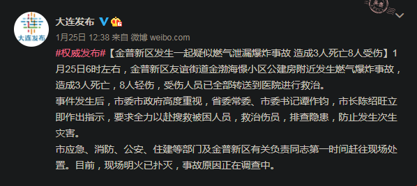 2021年1月25日,大連金普新區(qū)友誼街道金渤海憬小區(qū)公建房附近發(fā)生兩次爆炸,第一次爆炸發(fā)生后,現(xiàn)場(chǎng)約10臺(tái)車輛不同程度損壞并有車輛起火,消防接警后迅速到達(dá)現(xiàn)場(chǎng)救援。救援過(guò)程中,附近一汽車維修店又發(fā)生爆炸起火。事故造成3人死亡、6名圍觀者受傷,死者為一家三口。經(jīng)初步判斷為天成燃?xì)夤救細(xì)夤艿佬孤?dǎo)致爆炸,事故原因正在調(diào)查中。