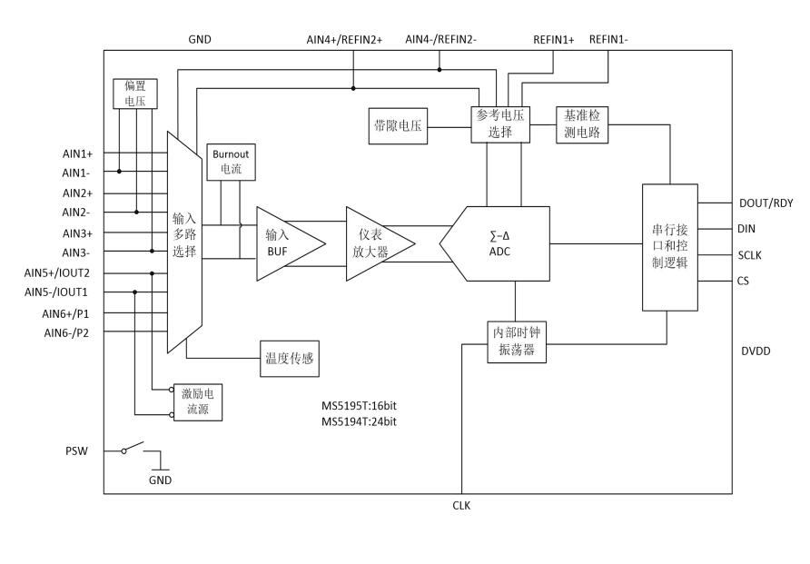 高精度模數轉換芯片 - MS5194T/MS5195T是適合高精度測量應用的低功耗、低噪聲、六通道差分輸入的24bit/16bit模數轉換器。其內部集成了低噪聲輸入緩沖器、低噪聲儀表放大器、精密低噪聲、低漂移內部帶隙基準,也可采用外部差分基準電壓。其片內還集成可編程激勵電流源、burnout電流源和偏置電壓發生器。偏置電壓發生器可將通道的共模電壓設置為0.5*AVDD。