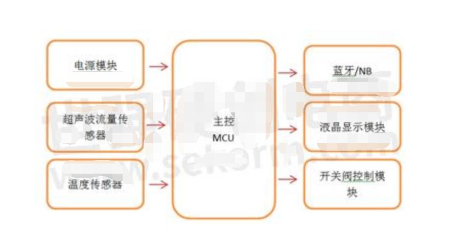 智能熱量表是通過一對溫度傳感器檢測上行管和下行管的水溫及流量計采集流量。從而算出熱交換系統(tǒng)的熱量進行計費的設(shè)備。其功能框圖如下: