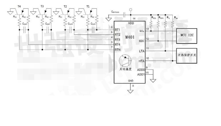 其次,推薦使用多路溫度傳感器芯片 - M401,它在遠程端測量是通過三極管來采集溫度,便于自動化生產。此芯片可測量溫度范圍-55~220oС,靜電防護HBM 8KV,MM 700V。且內部有I/O抗毛刺濾波器降低了干擾,而且集成測溫端開路、短路檢測,提高了可靠性;溫度數據有奇偶校驗和內置EEPROM,為用戶自定義設計及可靠性提供了保障。
