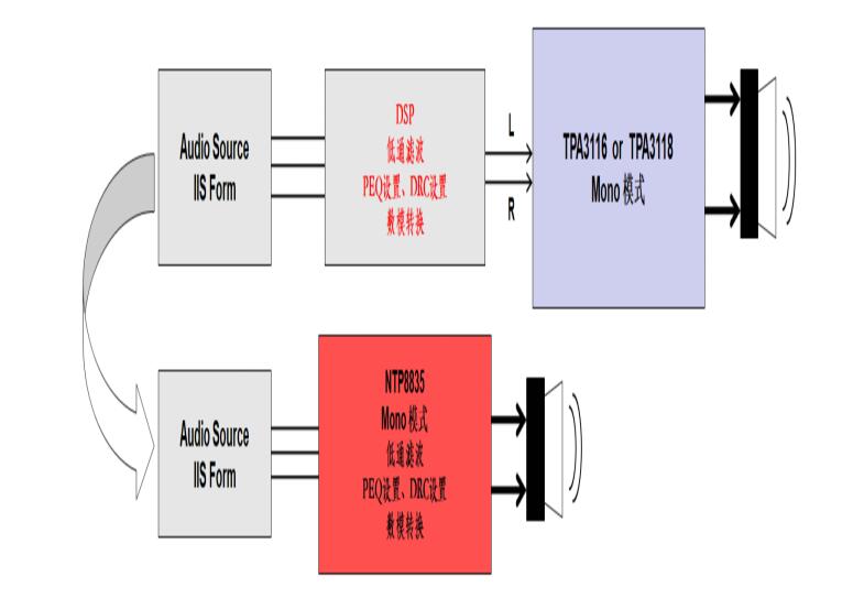 前些年慢慢就開始使用內置DSP數字功放的方案,如圖;