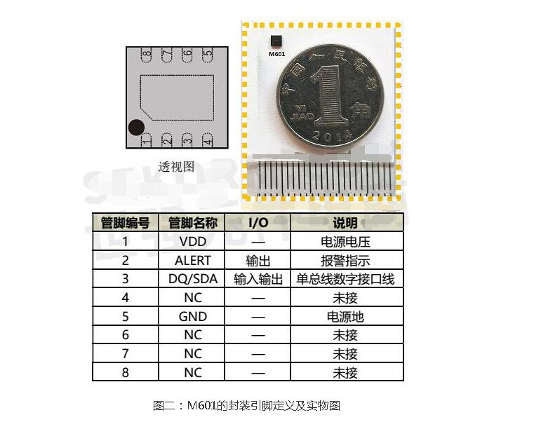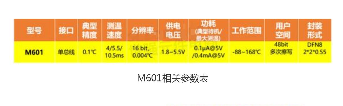 M601是國(guó)產(chǎn)的第四代數(shù)字高精度溫度傳感芯片,具有精度高(在32到43°C溫度區(qū)間,典型測(cè)溫精度0.1℃)、測(cè)溫快(速度可配置4ms/5.5ms/10.5ms)、功耗低、一致性好、可編程配置靈活等優(yōu)點(diǎn)。內(nèi)置非易失性 E2PROM 存儲(chǔ)單元,用于保存芯片 ID 號(hào)、高低溫報(bào)警閾值、溫度校準(zhǔn)修正等。M601具體的相關(guān)參數(shù)如下表一所示: