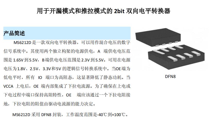電平轉換芯片 - MS6212可以用于橋接兩個不同的電壓節點,以成功連接電子系統中的邏輯門電平。它可以用在點對點拓撲中,用于連接在不同接口電壓下相互操作的設備或系統中。它的主要目標是用開漏模式與I/O口進行數據連接,例如I2C和1-Wire,數據是雙向傳輸且不需要控制信號,也可以用推拉模式與I/O口進行數據連接。