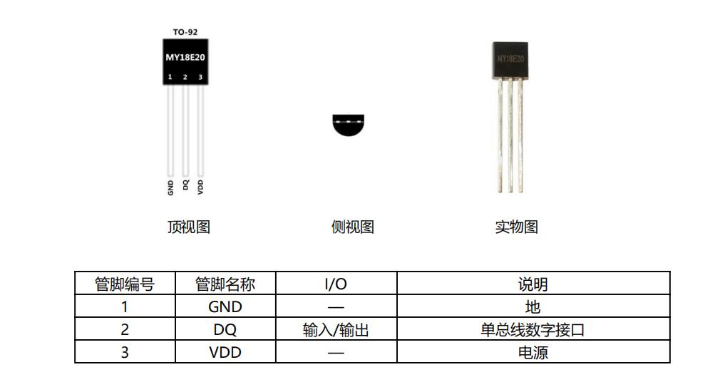 目前,溫度傳感芯片 - MY18E20只有TO-92的直插封裝,從引腳定義來講,和DS18B20的直插封裝的TO-92是完全相同的,可以直接替換。暫時還沒有SOIC-8的貼片封裝形式。下圖一是MY18E20的實物圖及引腳定義表: