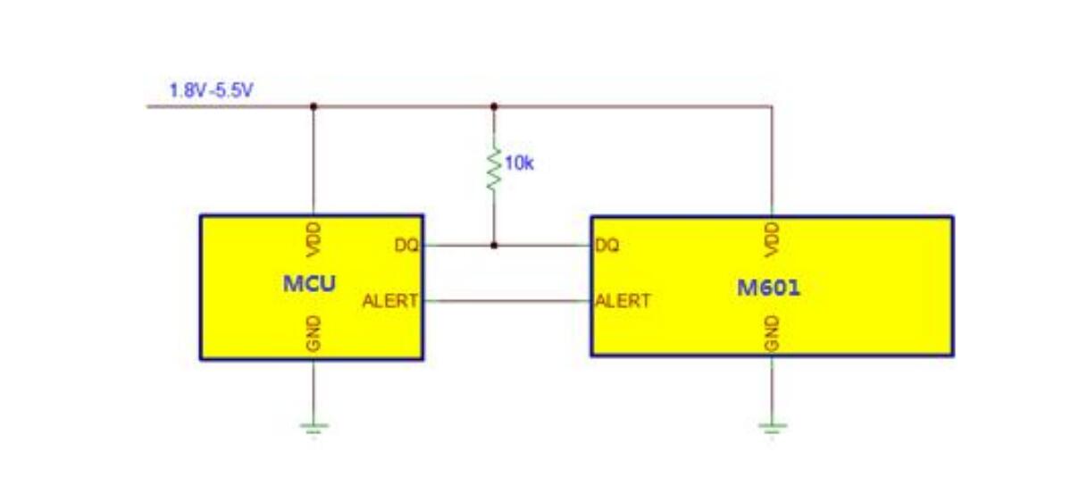 溫度傳感芯片 - M601內(nèi)部集成了溫度檢測(cè)元件、小信號(hào)放大、16位ADC模數(shù)轉(zhuǎn)換器、邏輯控制單元、溫度補(bǔ)償單元、電源管理等組成,芯片通過單總線ID尋址進(jìn)行數(shù)據(jù)讀取。M601溫度傳感器供電范圍為1.8V-5.5V,1s周期采集平均電流為5.2uA,待機(jī)電流0.1uA,超低的功耗為電池供電的電子體溫計(jì)提高更長(zhǎng)的使用壽命。M601封裝形式為DFN8,尺寸大小為2*2*0.55mm,超小的芯片尺寸非常適合電子體溫計(jì)的應(yīng)用。如下圖所示為M601典型應(yīng)用電路。