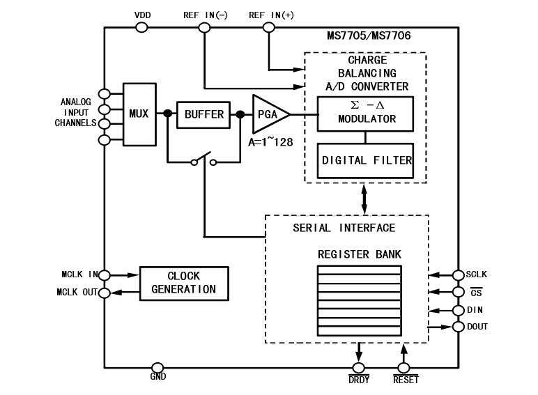 工采網代理的高精度模數轉換芯片 - MS7705/MS7706是一款用于低頻測量的模數轉換器。它采用了Σ-Δ轉換技術實現了輸出結果為 16 位的無失碼。工作電壓范圍為2.7V-3.3V 或 4.75V-5.25V。MS7705 具有2個全差分模擬信號輸入通道;MS7706 具有3個偽差分輸入通道。 MS7705/MS7706 非常適合用于智能,微控制器,或基于DSP的系統。它可通過串行接口來設置增益,信號極性,及輸出速率。還可以進行自校準和系統校準來消除系統的增益和偏移誤差。CMOS工藝確保了非常低的功耗,在待機模式下的功耗典型值為 20μW。
