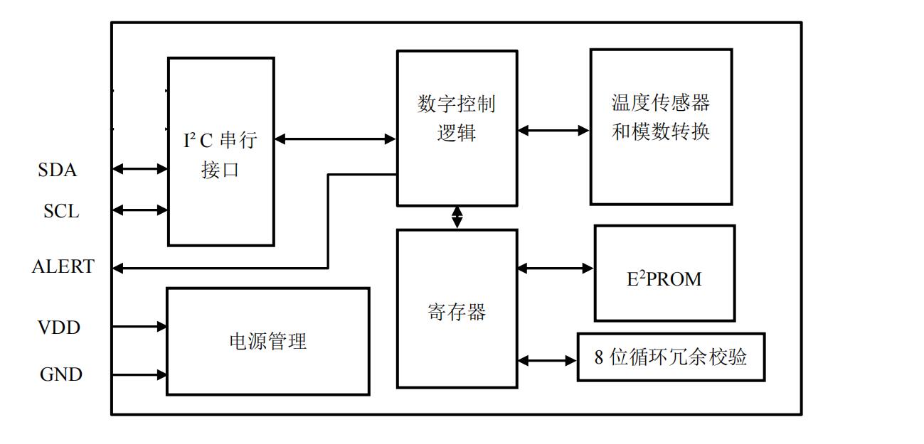 溫度芯片內置16-bit ADC,分辨率0.004°C,具有-70°C 到+150°的超寬工作范圍。芯片在出廠前經過100%的測試校準,根據溫度誤差特性進行校準系數的擬合,芯片內部自動進行補償計算。芯片支持數字I2C 通信接口、測溫數據內存訪問、功能配置等均可通過數字協議指令實現。I2C 接口適合高速率的板級應用場景,高接口速度可達400kHz。