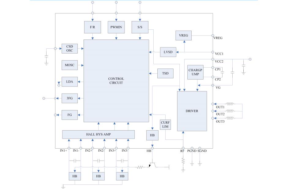圖1是MS8828無刷電機驅動的內部框圖及典型外圍電路,它是純硬件設計,外圍電路連接正確、電機線和霍爾線序正確后,只需給芯片VCC電源供電即可驅動一個三相無刷電機轉動。