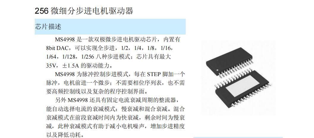步進馬達驅動芯片 - MS4998為脈沖控制步進模式,每在STEP腳加一個脈沖,電機前進一個微步;不需要相位序列表,也不需要高頻控制線以及復雜的程序控制界面。