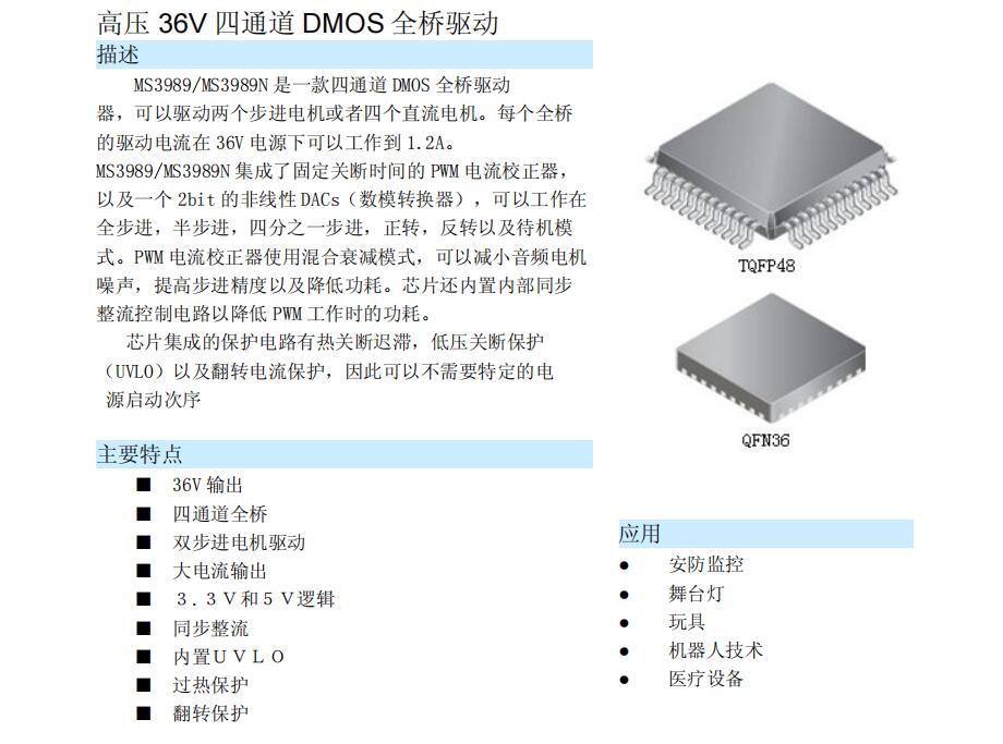 步進馬達驅動芯片 -?MS3989/MS3989N芯片還內置內部同步整流控制電路以降低PWM工作時的功耗。芯片集成的保護電路有熱關斷遲滯,低壓關斷保護(UVLO)以及翻轉電流保護,因此可以不需要特定的電源啟動次序。
