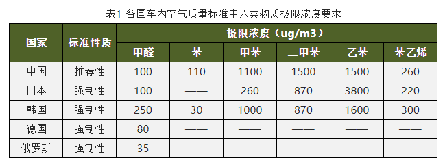 鑒于車內VOC對人體健康的危害,我國在2012年制定發布了國標《乘用車內空氣質量評價指南》(GB/T 27630—201 1)作為車內空氣質量管制法規,該標準規定了8種新生產車的揮發性污染物排放檢測方法和標準,污染物分別是:苯、甲苯、二甲苯、甲醛、乙醛、丙烯醛、苯乙烯、乙苯。