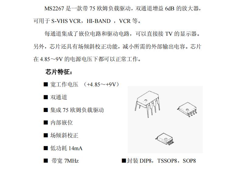 視頻驅動放大器 - MS2267每通道集成了嵌位電路和驅動電路,可以直接接TV的顯示器。另外,芯片還具有場傾斜校正功能,減小所需的外部輸出電容。芯片在4.85~9V的電源電壓下都可以正常工作。