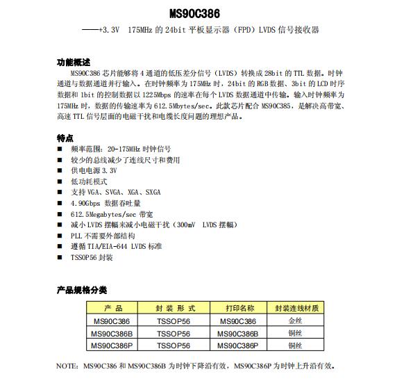 工采網代理的國產品牌Ruimeng?TECHNOLOGY推出的低壓差分傳輸接口芯片 -?MS90C386B接收器設計用于支持NTSC至SXGA分辨率的主機與平板顯示器之間的像素數據傳輸。視頻接口芯片 - MS90C386B將LVDS數據流轉換回28位CMOS/TTL數據,并選擇上升沿或下降沿時鐘,以方便使用各種LCD面板控制器。在175Mhz的發射時鐘頻率下,每個LVDS信道以1225Mbps的有效速率發射24位GRB數據和4位定時和控制數據(HSYNC、VSYCN、DE、CNTL)。使用175MHz時鐘,數據吞吐量為612.5Mbytes/sec。