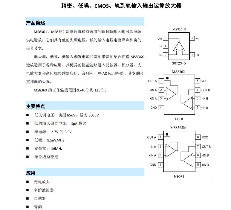 低失調(diào),低噪,低輸入偏置電流和寬的帶寬的結(jié)合使得MS8361、MS8362運(yùn)放適用于各種應(yīng)用。其優(yōu)異的性能能夠進(jìn)入濾波器,積分器,光電放大器和高阻抗傳感器應(yīng)用,音頻和一些AC應(yīng)用得益于其寬的帶寬和低的失真。
