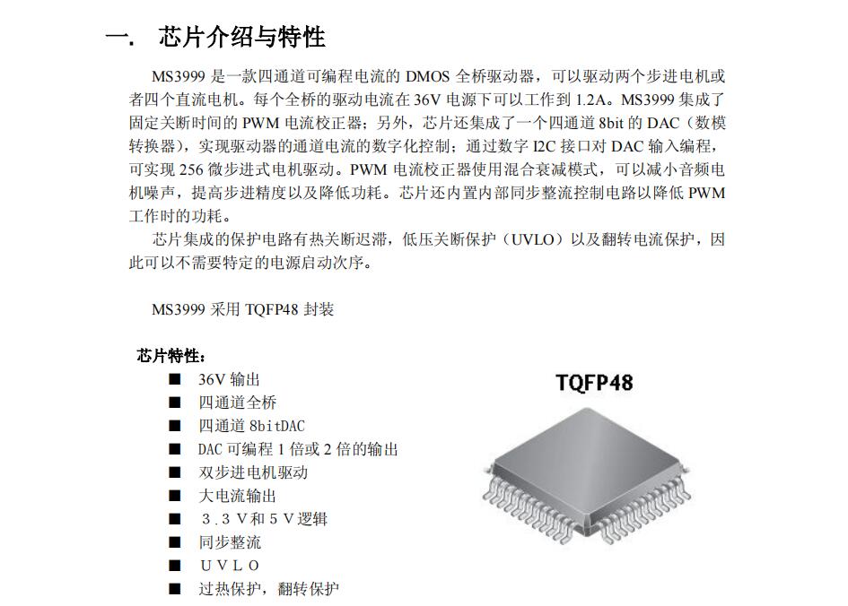 步進馬達驅動芯片 -?MS3999采用TQFP48封裝。