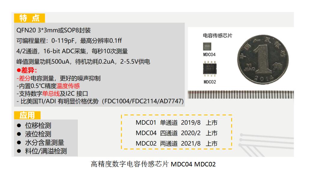 高精度電容傳感芯片可編程量程寬,0~119pF;分辨率高,高分辨率可達0.1ff;4/2通道測量,16 bit ADC采集,每秒10次測量;2V~5.5V供電;平均功耗4.5μA;尺寸小,QFN20或SOP8封裝(MDC04與MDC02主要區別在于通道數和封裝不同)。
