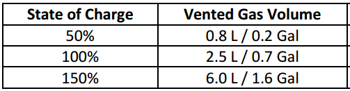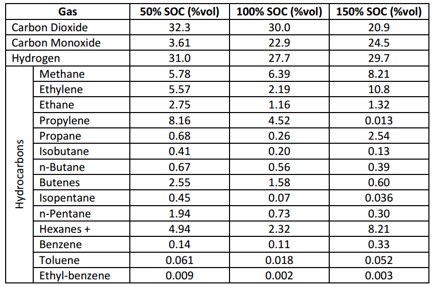 同時測量釋放出來的氣體的含量(表2),從50%SOC到100%SOC,熱失控后釋放出來的氣體含量增加了3倍多。在150%SOC,釋放的氣體含量達到了50%SOC下的7.5倍,一個小小的電池竟然可以釋放出這么多的氣體。