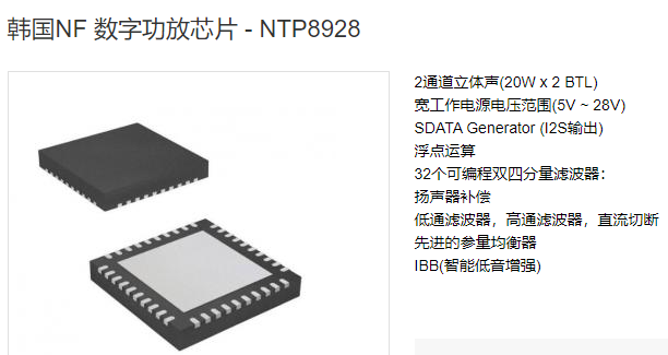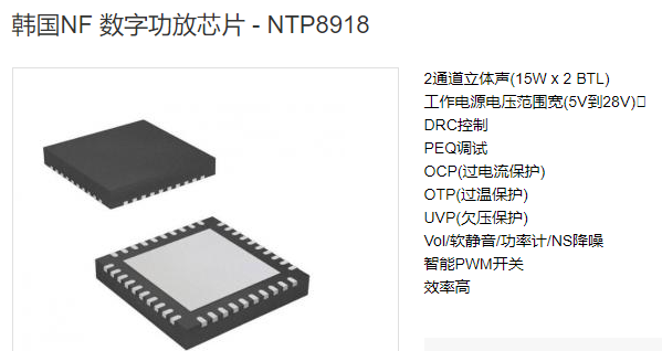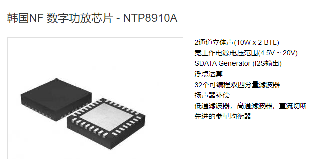 5v供電的數(shù)字功放芯片有哪些?這里推薦幾款性價比較高的數(shù)字功放芯片由工采網(wǎng)代理的韓國NF系列:NTP8810A、NTP8910A、NTP8918、NTP8928等支持采樣信號模擬輸出和數(shù)字模擬信號的傳輸,滿足32可編程雙四分濾波器,包括功率級的音頻放大器音響放大器系統(tǒng)芯片,內(nèi)部既可以實現(xiàn)數(shù)字功放電壓轉(zhuǎn)換信號,還支持電流轉(zhuǎn)換信號,可以兼容各種不同規(guī)格的功放功率。多功能數(shù)字音頻信號處理功能齊全,高性能,保真度高,全數(shù)字PWM調(diào)制器兩種大功率全橋MOSFET功率級,所有功能都可以通過I2C由內(nèi)部寄存器值控制主機接口總線。以下是幾款芯片的詳細參數(shù)特性概述: