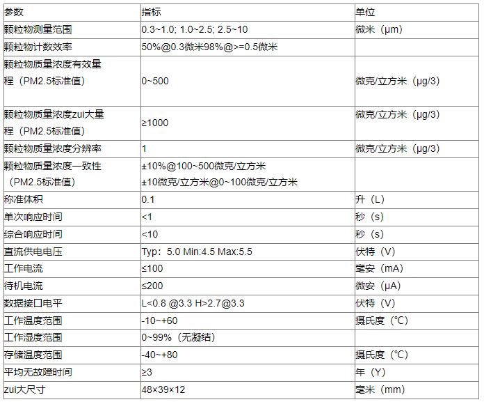 注1:zui大量程指本傳感器確保PM2.5 標準值zui高輸出數值不小于1000 微克/立方米。1000 微克/立方米以上以實測為準。