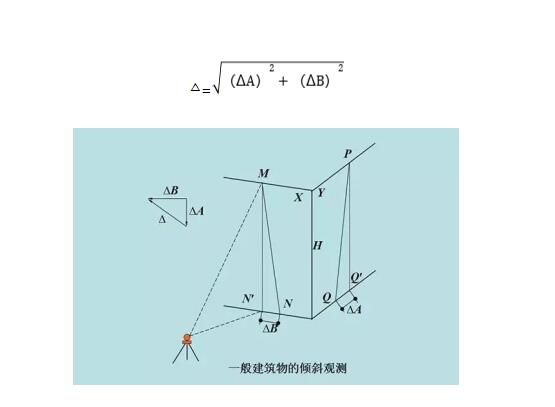傾斜測量主要是測定建筑物主體的偏移值Δ。偏移值Δ的測定按規范采用經緯儀投影法,為下圖ΔA 和ΔB的平方和的根。