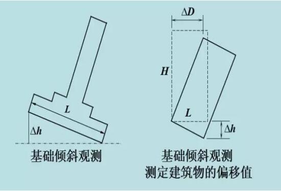比如結合精密水準測量測定建筑物基礎兩端點的沉降量差值Δh,再根據建筑物的寬度L和高度H,推算出該建筑物主體的偏移值ΔD,即