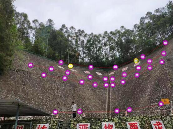 下圖為多點藍牙傾角計監測的應用案例。廣西某武警支隊后山擋土墻有鼓脹、裂縫等形變,為防止崩盤、滑坡等地質災害,根據實際形變隱患點布置了30處藍牙傾角計,如下圖粉色點所示。由于整個安裝區域面積較大,部分監測點有巖體及植被的遮擋,4G藍牙網關在中心處布置了兩臺,如黃色點所示,每臺負責15臺傾角計的監測平臺接入。