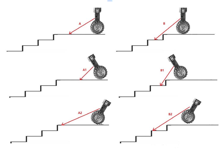 如下圖所示:道路較平坦時(shí),測(cè)距距離在 A1 到 A2 范圍內(nèi),并且距離變化較為連續(xù);前方有階梯或者凹陷時(shí),測(cè)距距離值會(huì)有明顯跳變,相同姿態(tài)下數(shù)值變大,(B>A,B1>A1,B2>A2)。