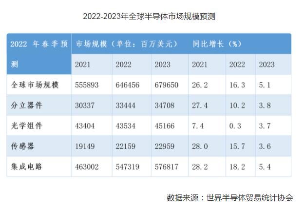雖然面臨疫情防控、世界經濟復蘇放緩等一系列不確定性因素,集成電路產業仍在承壓前行。世界半導體貿易統計協會6月發布的春季預測顯示,2022年全球半導體市場規模將增長16.3%,繼2021年年增26.2%之后繼續保持兩位數的增長,達到6460億美元。集成電路、傳感器、分立器件等主要半導體品類的市場規模也將保持兩位數增長。