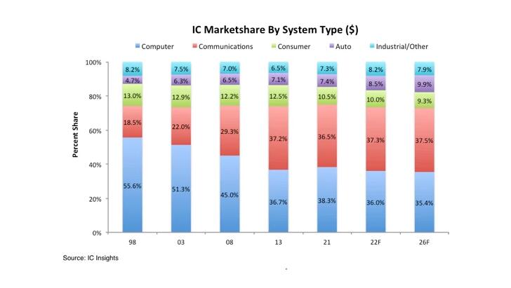 9月28日消息,據半導體調研機構IC Insights新發布的報告顯示,全球汽車芯片市場自1998年以來穩步增長,從當年在全球整體芯片銷售額當中占比僅4.7%,到2021年已經增長至7.4%。相比之下,原本占比高達55.6%的電腦芯片,近年來占比一直在降低。