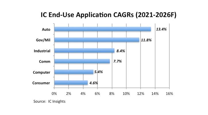 IC Insights認為,這些因素將導致汽車市場在 2021-2026 年的任何主要用途領域的復合年增長率較高,達到了13.4%,成為增速較快的一類芯片市場。不過,鑒于其相對較小的規模,汽車芯片領域的高增長不足以顯著提升未來五年整個芯片行業的增長率。